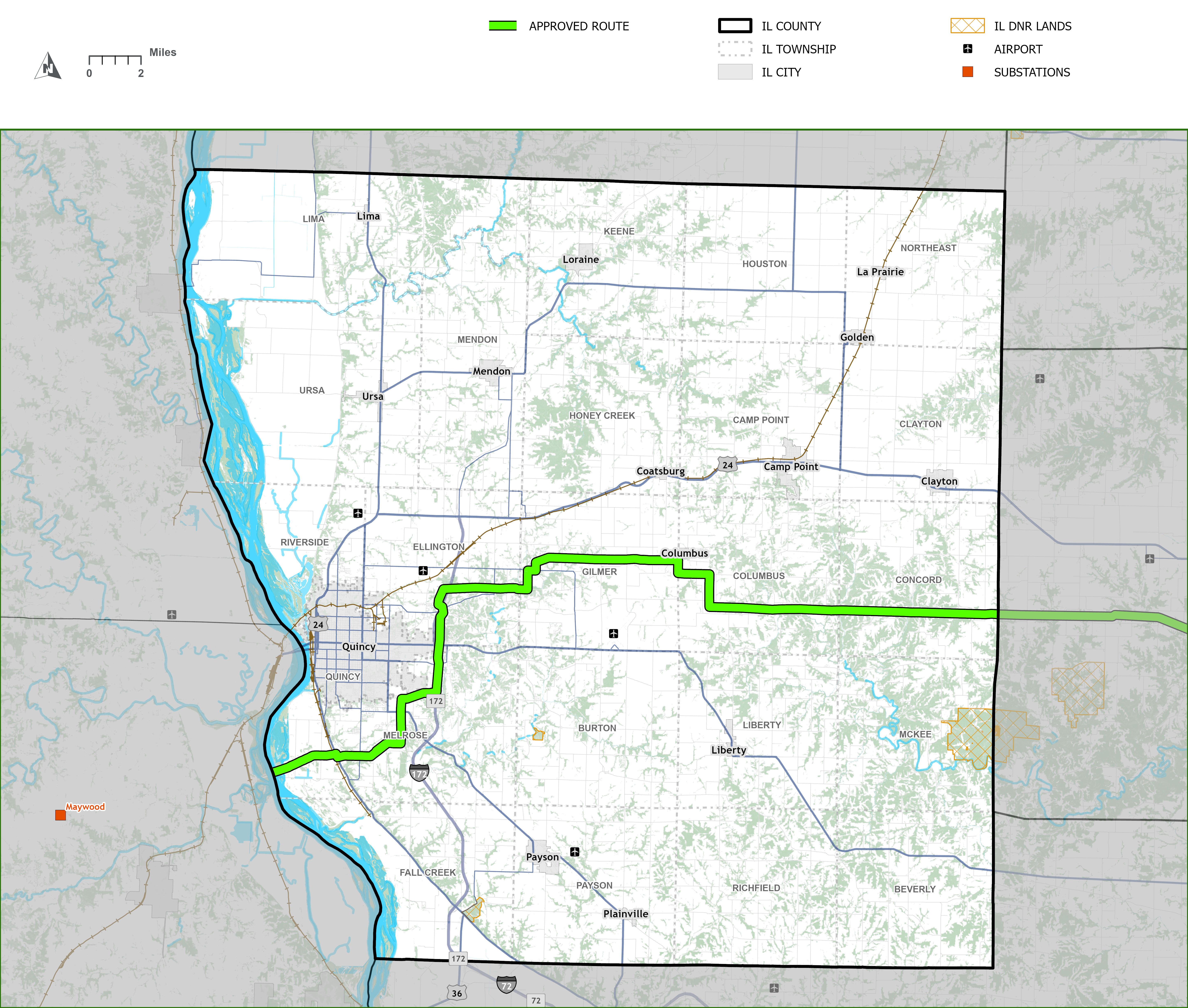 The Approved Route has approximately 2 miles of new transmission lines. The new 345 kV circuit will be constructed in a new corridor to connect separate existing transmission corridors to utilize existing structures to cross the Illinois River.