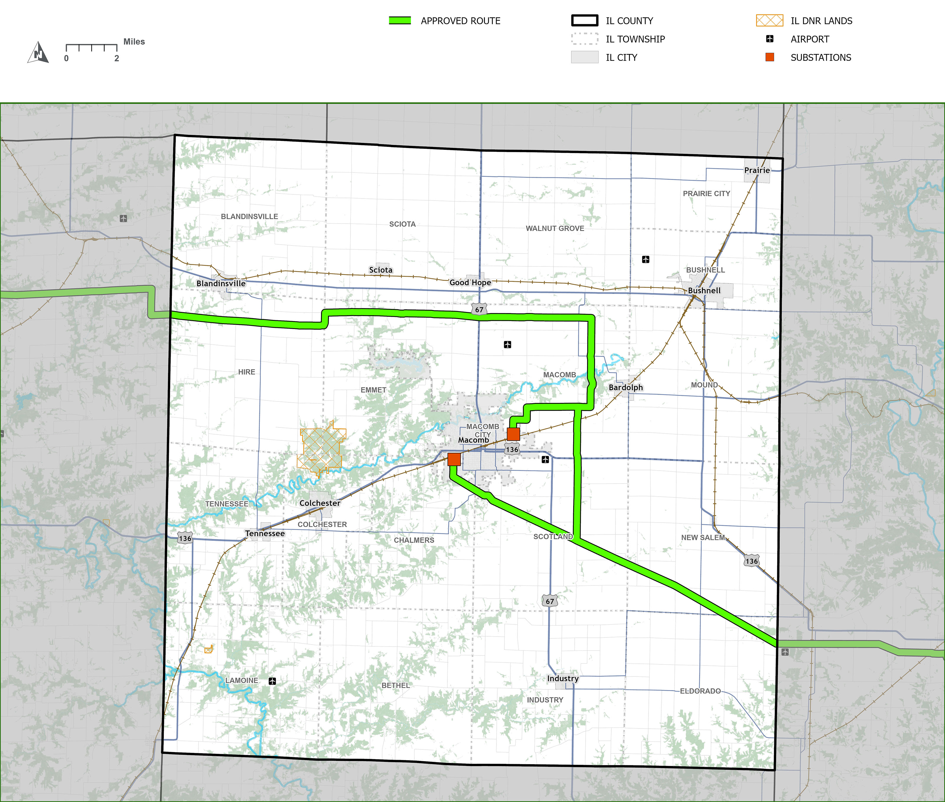 The Approved Route includes two options (pink or blue) to build a new, 138 kV and 345 kV double circuit north of the City of Macomb. We will only be constructing one of these routes for the line.