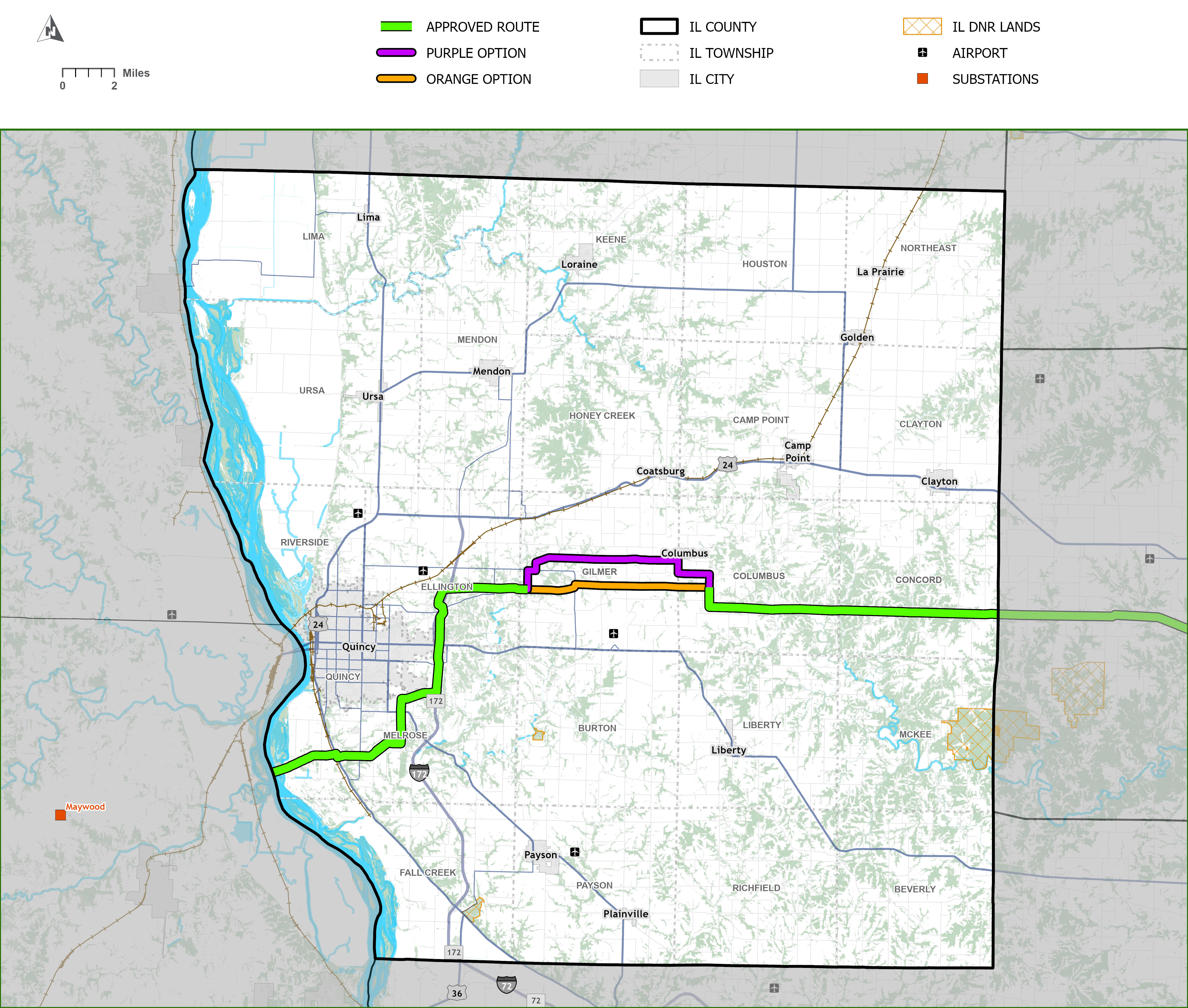 The Approved Route includes two options (pink or blue) to build a new, 138 kV and 345 kV double circuit north of the City of Macomb. We will only be constructing one of these routes for the line.