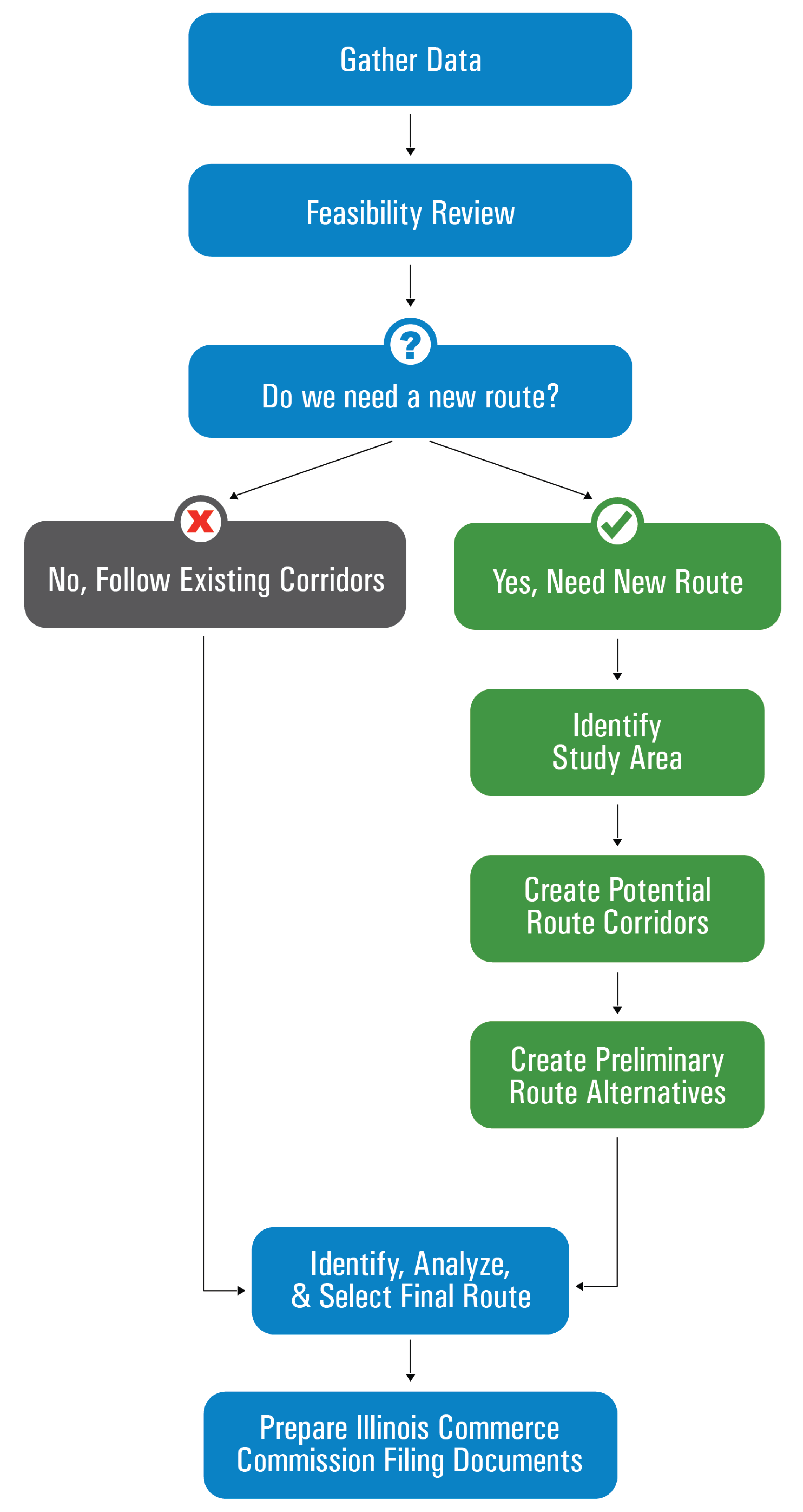 The Approved Route has approximately 2 miles of new transmission lines. The new 345 kV circuit will be constructed in a new corridor to connect separate existing transmission corridors to utilize existing structures to cross the Illinois River.